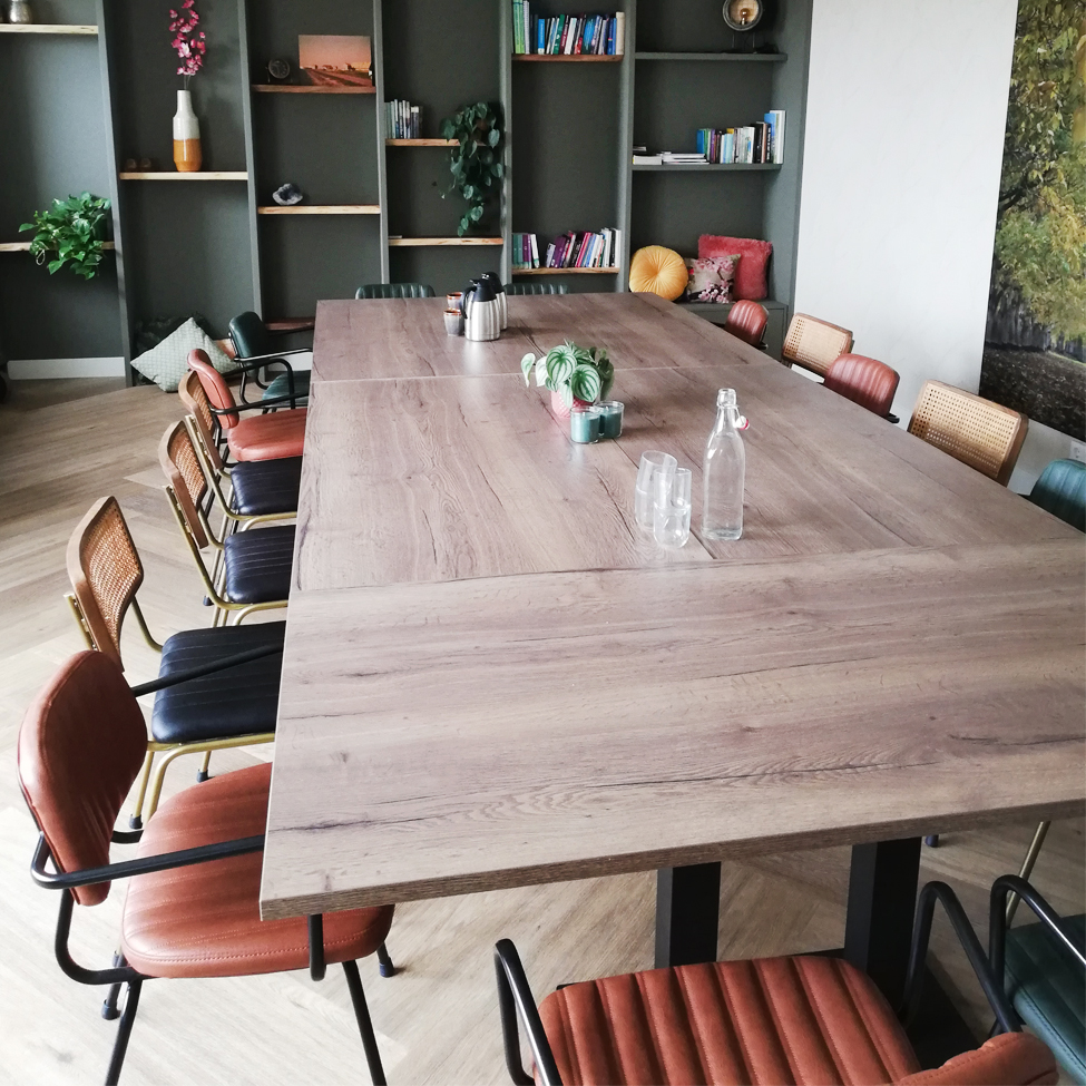 We bieden ruimte voor zestien personen en op het erf zijn er veel leuke plekken om te zitten, praten, leren of te creëren. Extra: er is een eigen keuken om gezamenlijk een lunch te bereiden.
